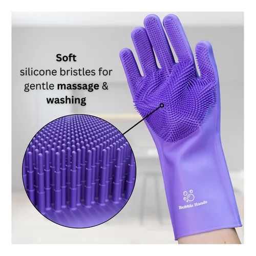 Guantes de silicona con cerdas suaves ideales para bañar mascotas o lavar loza. Resistentes, reutilizables, antideslizantes y fáciles de limpiar. Multiuso y prácticos.